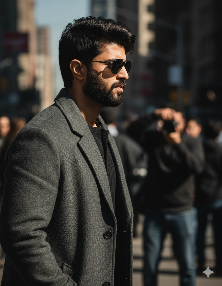 “A highly realistic cinematic portrait of tho person from tho upload-ed retorence photo. recreated with the user s own face and hair-style, The subject is weoring Stylish sunglasses identical to the ref-oronco, drossod in a dark shirt with an oversizod gray wool coat layered on top. He stands outdoors in a candid street-photography moment, captured from the side with dramatic lighting and shadows. Tho expression is sorious, confidont, and masculino.