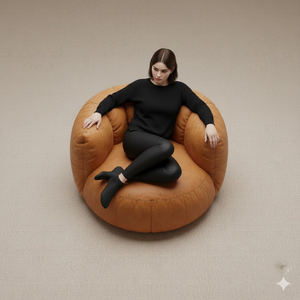 Top-view photo of a modern lounge chair from attached photo, placed on a soft beige floor. A white woman with dark hair, dressed in minimal black clothing, sits naturally and relaxed in the chair, her posture casual yet elegant, fitting into its wide, cushiony form.