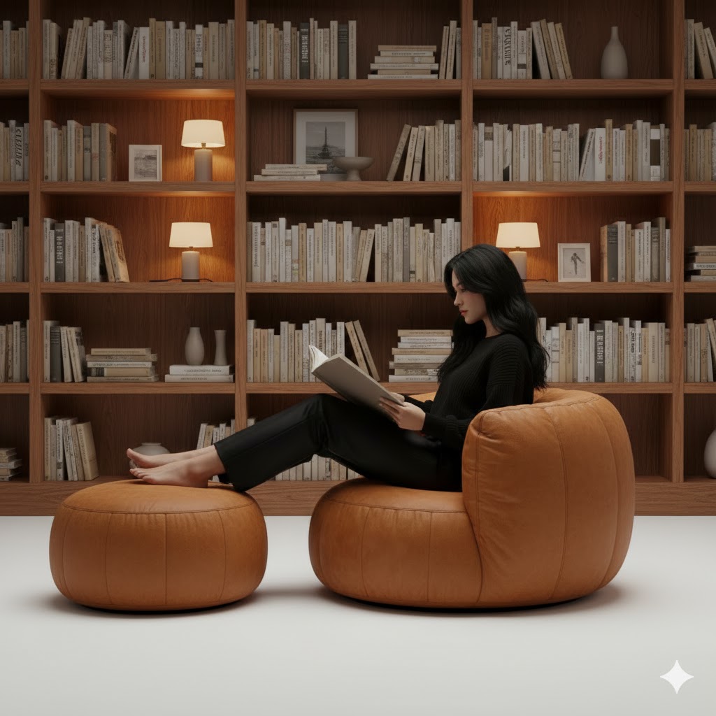 A cozy evening living room with a large built-in wooden bookshelf in the background, softly illuminated by warm ambient light. In the center stands a lounge chair with a matching footstool from [ product attached image]. A woman with long black hair, dressed in sleek black clothing, sits comfortably in a relaxed side-profile pose, reading a book with her feet resting casually on the footstool.