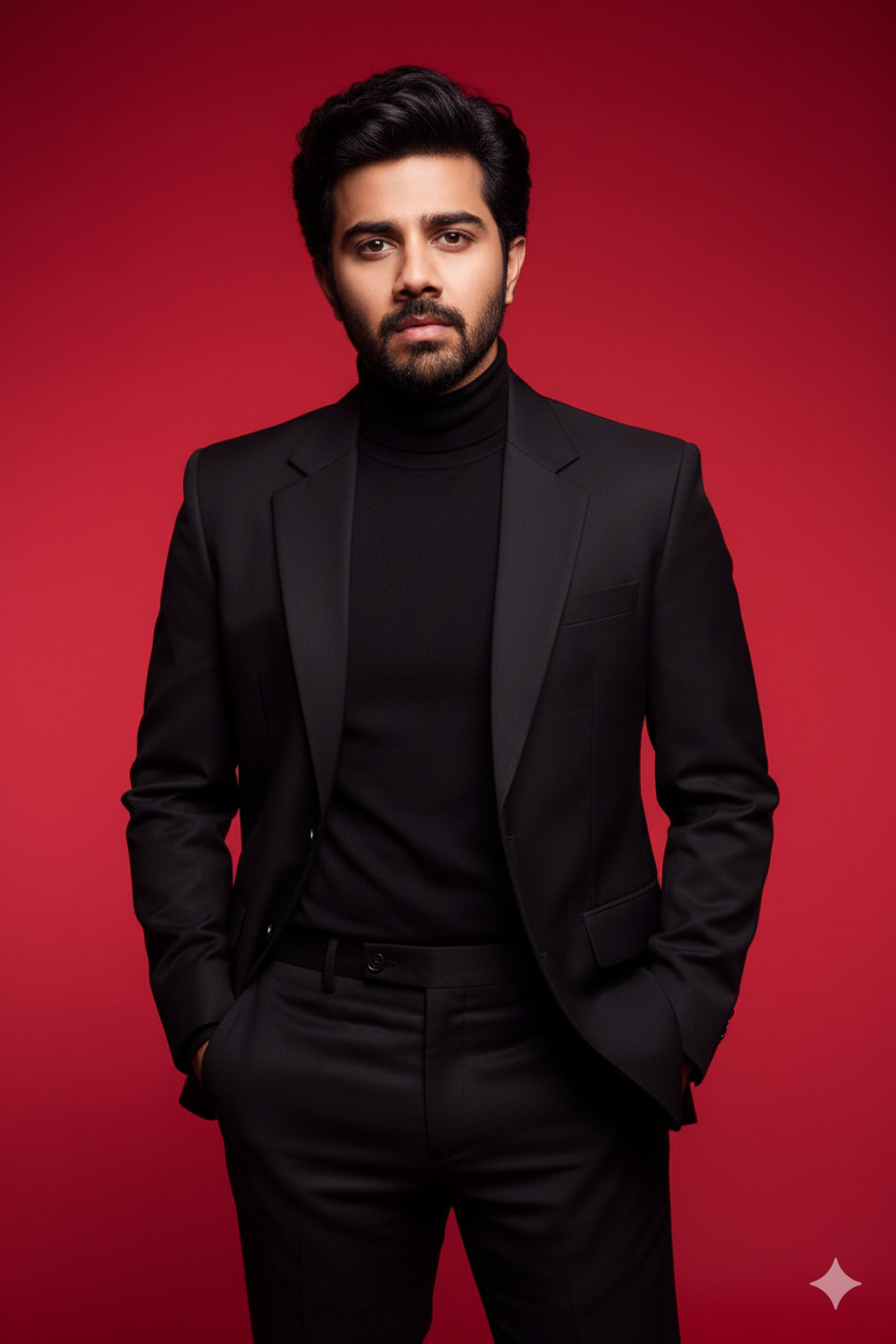 A cinematic editorial studio portrait of a confident man wearing a full black outfit – black turtleneck and black tailored suit – standing with both hands in pockets, intense gaze, pose against a bold red gradient background. The lighting is smooth and directional, creating soft shadows on the face and suit, emphasizing facial structure and clean lines. Studio setting with no distractions, fashion-forward atmosphere. Created Using: 85mm portrait lens, high-contrast lighting setup, fashion magazine style, minimal color palette, cinematic red backdrop, matte finish texture, DSLR depth rendering, studio fashion photography –ar 2:3 –v 6.0