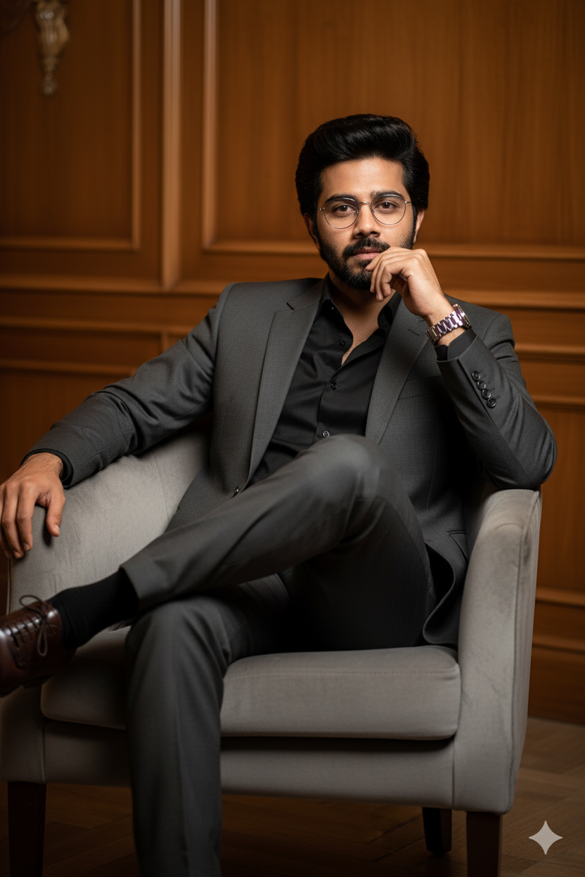 Ultra-realistic cinematic portrait of a confident man seated in a luxurious armchair inside a refined, wood-paneled room. The composition captures a full-body or three-quarter view, showing the subject in a relaxed yet powerful posture. He sits slightly reclined, legs apart, with his left arm resting naturally on the armrest and his right hand raised near the face in a gesture of calm confidence, as if reflecting or about to speak. His expression conveys authority, composure, and leadership – exuding the aura of a successful entrepreneur or visionary professional. The subject wears a tailored dark gray suit with a black dress shirt underneath, no tie, blending modern elegance and subtle sophistication. His display realistic fabric texture and natural folds, emphasizing sophistication. His shoes are polished, matching the tone of the outfit, complementing the setting with a refined look. The environment is illuminated with warm cinematic lighting – soft key light from the front-left, accentuating facial contours and casting smooth shadows. Background lighting highlights wood tones with gold undertones, while polished brown tones and subtle reflections, creating an atmosphere of luxury and focus. The armchair is plush and upholstered in gray velvet, detailed with realistic fabric texture and stitching, matching the elegance of the suit. Accessories: On his wrist, a metallic watch subtly reflects light, adding a touch of realism on the left arm but without dominating the scene. The rim of his glasses may add a subtle reflection to one part of the frame, reinforcing the elegant and executive mood. Camera setup: 50mm or 85mm lens, mid-distance shot, cinematic depth of field and resolution, strong skin tones and shadow separation. Direction: Let the subject look forward for dominance. Replace the subject’s pose with Felipe’s photo reference if submitting for accuracy. Background must reflect the upscale setting. Precise realism, anatomy accuracy, and soft cinematic lighting on face and hands. Style: ultra-realistic photography, 8K resolution, cinematic tones, professional color grading, magazine style, soft and realistic details/textures, subtle contrast. Perfect for portraying authority, luxury, and strategic mindset.