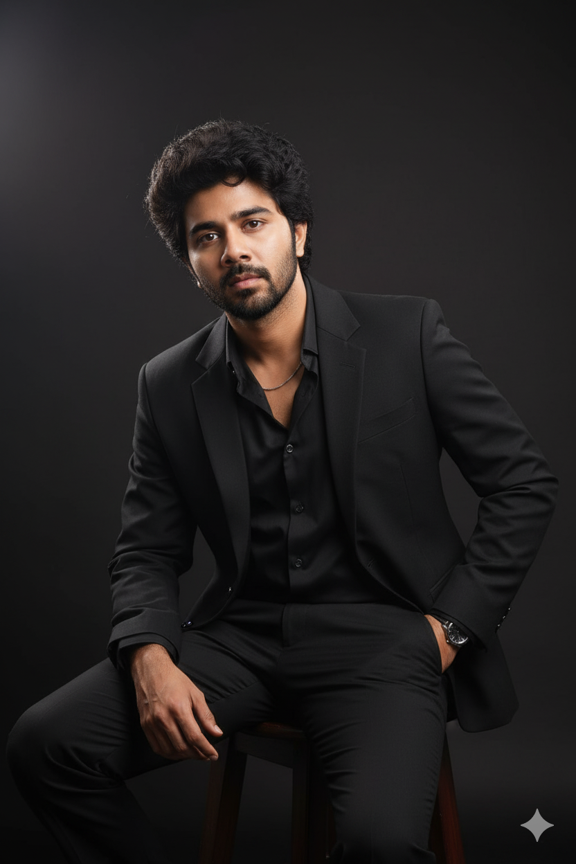Portrait exact same confident looking person as in the attached reference image. Realistic with an attitude expression and is sitting on a wooden stool against a dark studio background. He is wearing a well-fitted, all-black suit with a black shirt, and black pant, small silver chain on the neck and small silver watch, slightly unbuttoned at the top, exuding a powerful aura. His posture is relaxed yet dominant, with one arm resting on his leg and the other one in his pant pocket. The lighting is soft but directional.