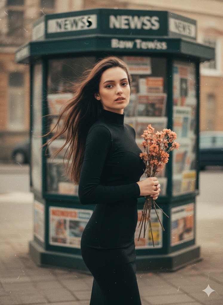 The generated image uses the uploaded image as a reference for the character, wearing a high-necked, tight-fitting black long-sleeved dress. A cluster of withered wood and orange-pink flowers lies beside an old newsstand, the grainy texture of vintage film interwoven, the blurred background with noticeable trailing shadows, and the double-image effect creating a fantastical atmosphere. A bewitchingly beautiful girl, carrying flowers, is shown in profile, her fair skin delicate and translucent. Her exquisite face is blurred with motion, the outline of her figure slightly swaying with the panning camera, the soft focus making the image even more hazy and languid. A warm-toned, low-saturation filter enhances the effect, her long, backlit hair glowing with a soft glow, the messy strands sweeping wildly across her jawline, the details concealing a captivating yet dangerous allure. Cute movements add dynamism, the motion blur blending with the film grain, creating a trendy, Instagram-worthy image while the blurred image outlines a dynamic scene full of story, cleverly balancing bewitching and sweetness. Looking towards camera. 100% matching with my face.