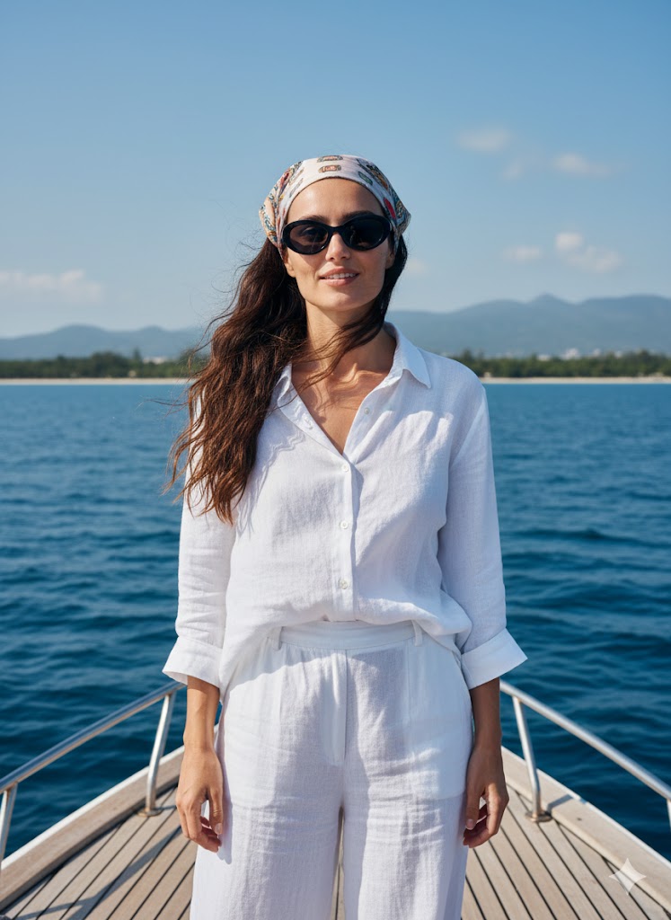 She wears minimal, natural makeup, preserving realistic skin texture and subtle natural highlights, matching the reference precisely. Her eyes are partially visible behind dark oval sunglasses, which must not obscure or alter facial identity. Outfit: white lightweight linen button-up shirt matching white loose-fit linen pants. The clothing should appear airy, relaxed, and coastal, with realistic fabric texture and natural folds. Accessories are minimal and include a light-colored patterned bandana worn on her head and the sunglasses, with little to no jewelry.