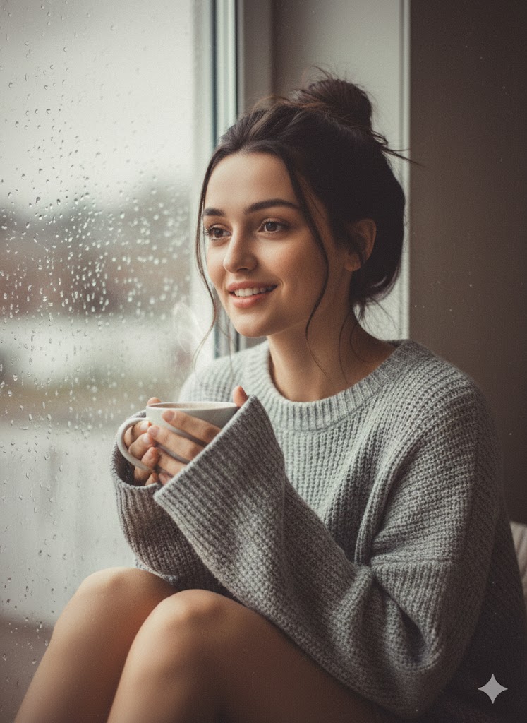 Depict the woman sitting indoors beside a rain-streaked glass window, creating a cozy, intimate ambience. Soft natural light falls gently across her face, with raindrop bokeh visible outside the window. She is wearing a grey oversized knit sweater, with sleeves slightly covering her palms. She holds a warm coffee mug softly with both hands, posed naturally without changing the facial expression from the reference.