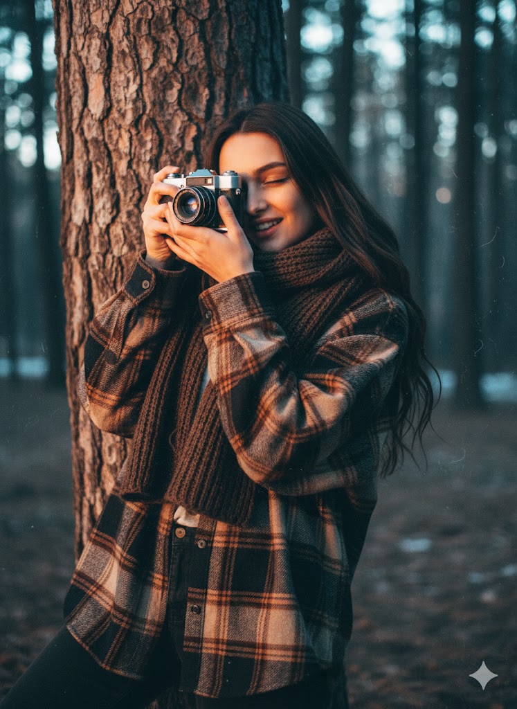 Cinematic high grain 90s portrait Dutch angle tilted shot, 23-year-old woman leaning against tree taking picture dynamic composition, wearing oversized flannel shirt layers winter, long hair hanging sideways, serene dreamy atmosphere but dynamic framing, warm orange cool blue contrast nostalgic grading, heavy film grain texture noise throughout, artistic playful moment nature photography, diagonal tree lines background, vintage 90s aesthetic mood, editorial nostalgic winter artistic captured, modern retro film noise. Close portrait.