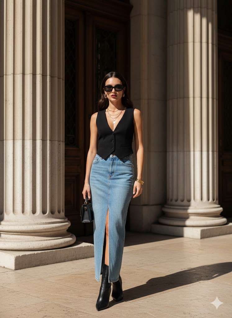 Person: The woman is tall, midsize, with long, slightly wavy dark hair that is loose and wearing dark sunglasses. Clothing: She’s wearing a modern and stylish combination — a long, fitted denim skirt in a light wash that reaches the floor. The skirt has a high central slit in the front. A fitted, sleeveless black vest with a V-neck. Black, tall boots with a pointed toe and heel that disappear under the length of the skirt.