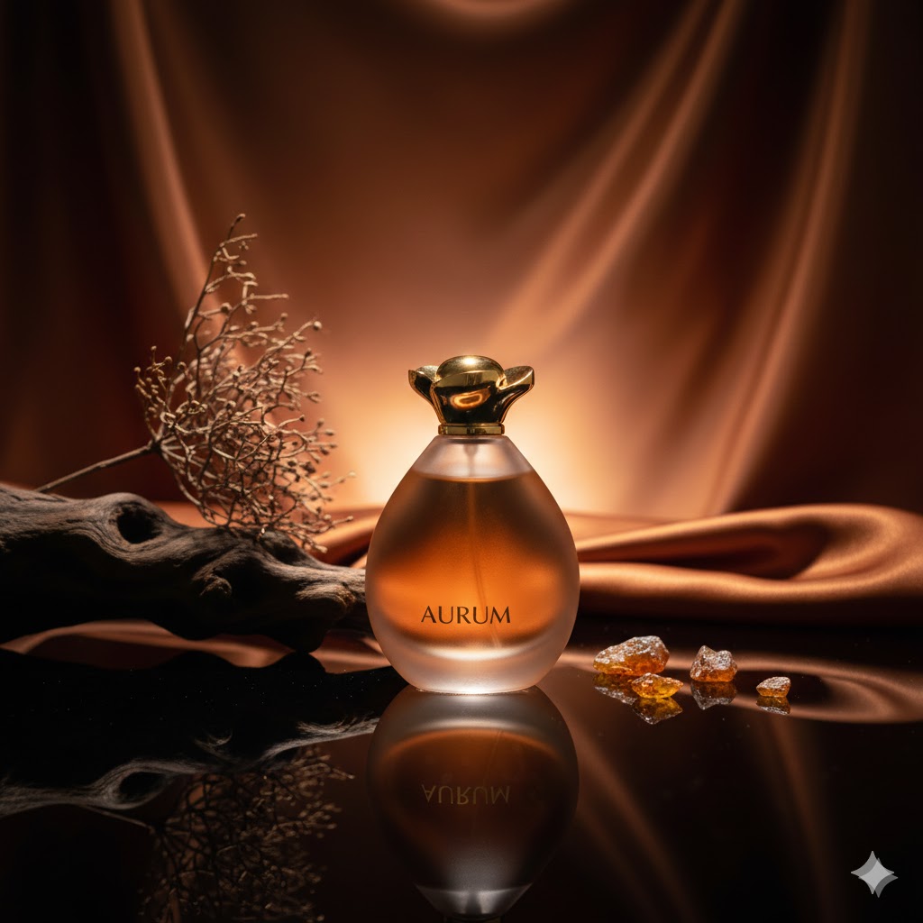 Details: Sharp focus on the product, shallow depth of field (bokeh) on the fabric background. Rich color palette of amber, copper, and deep blacks. Elegant, mysterious, premium look