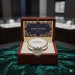 Atmosphere: Luxurious, heritage-rich, precious. The composition conveys that the jewelry is a treasured, heirloom-quality item worthy of careful presentation and safekeeping. The premium presentation surface elevates the jewelry’s prestige and craftsmanship story.