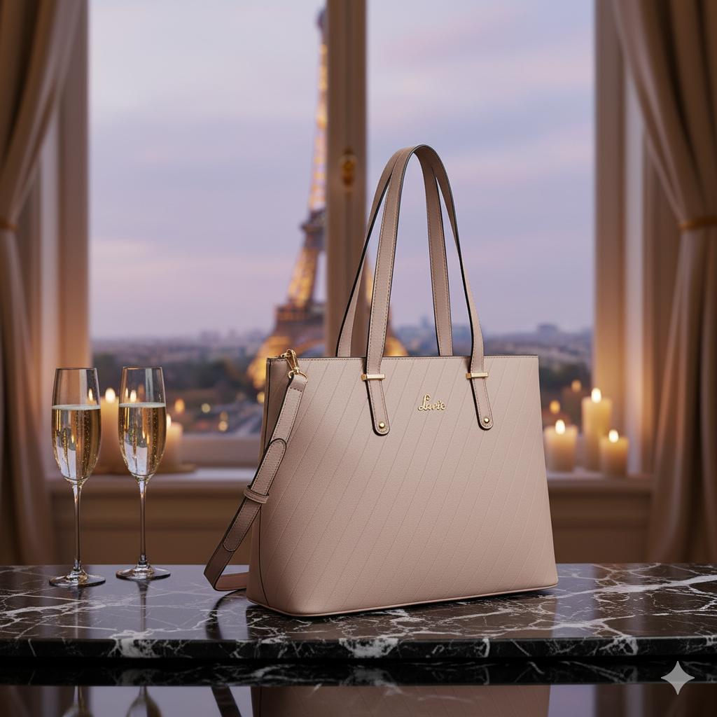 {product} large in the foreground on a polished slab of black‑veined marble; soft mirror reflection amplifies presence. Background: the Eiffel Tower twinkles as bokeh against a lavender dusk sky; champagne flutes, silk curtains, and golden candle flames form a halo of elegance. Parisian skyline reduced to a dreamy backdrop; the product dominates with haute couture still‑life energy.