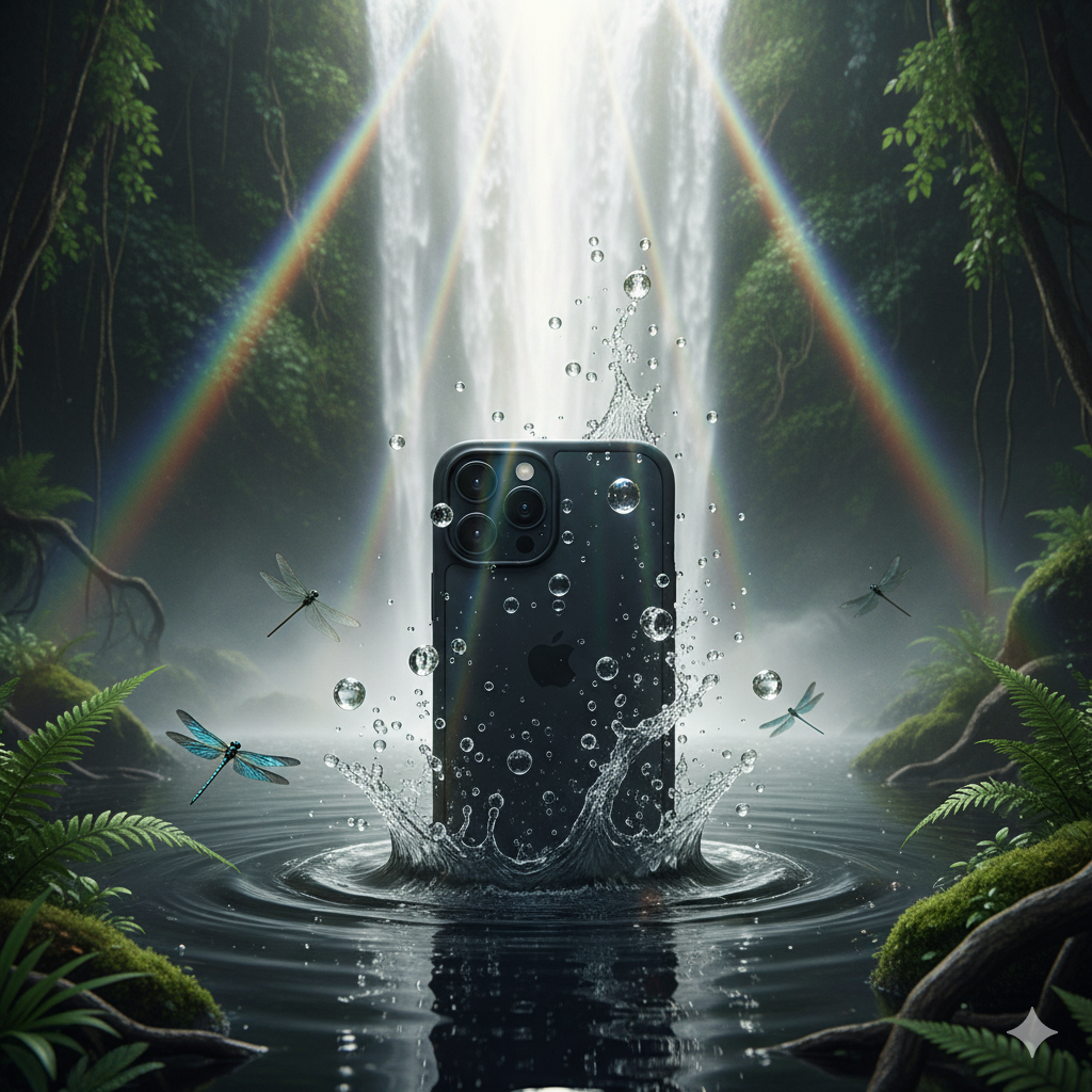 “{product} large in foreground at waterline, emerging from a jungle pool; hyper‑real droplets on surface. Blurred waterfall as a white energy pillar; sunbeams through mist; fern and moss framing; a few dragonflies. 80mm, f/2.8 shallow depth, fast shutter; keep highlight detail; natural water ripples. Aspect ratio {ar}. No text, no watermark, no duplicate subject, no fake bubbles, no warped logos.” -