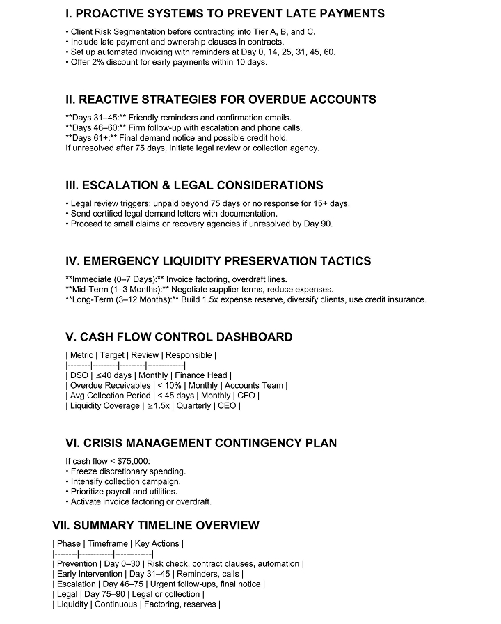 Remember to tackle the problem methodically. Craft a multi-layered strategy that includes prevention methods, early intervention protocols, escalation procedures, and emergency liquidity measures. Provide clear timeframes for each action, communication templates that balance professionalism with urgency, and contingency plans for worst-case scenarios. Segment clients based on payment risk, establish efficient collection workflows, and maintain cash flow during prolonged collection periods.