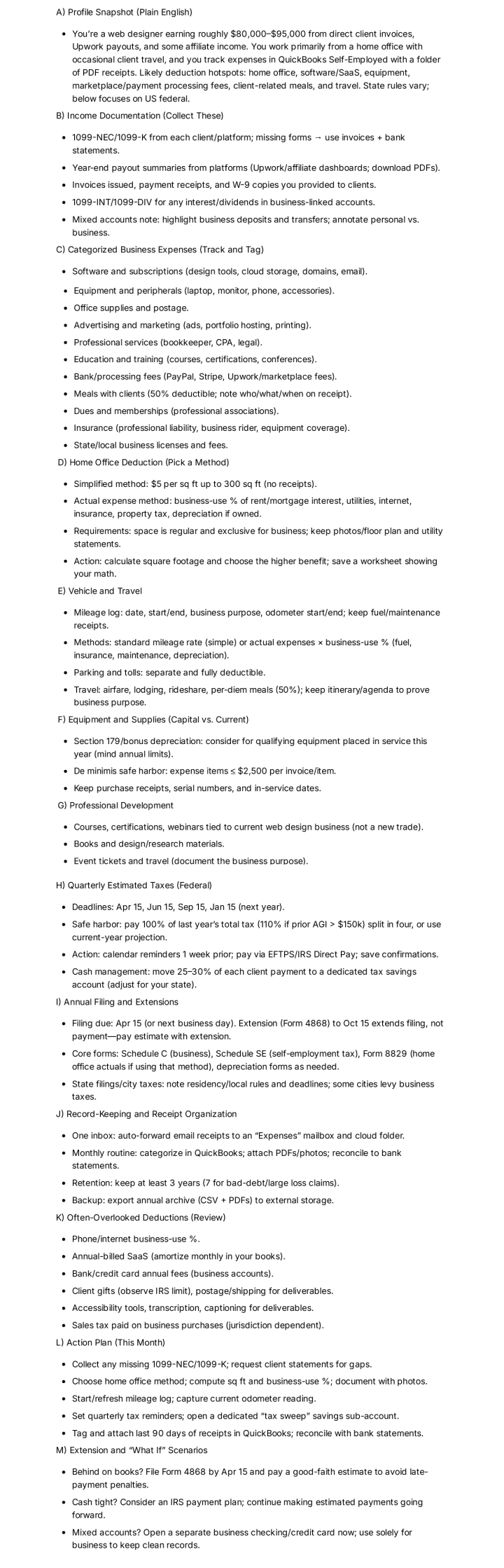 One paragraph summarizing the freelance setup, income complexity, and tracking method, plus any likely deduction hotspots for this profile.