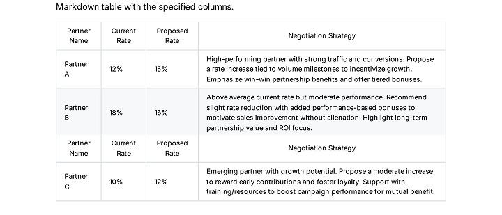 | Partner Name | Current Rate | Proposed Rate | Negotiation Strategy |